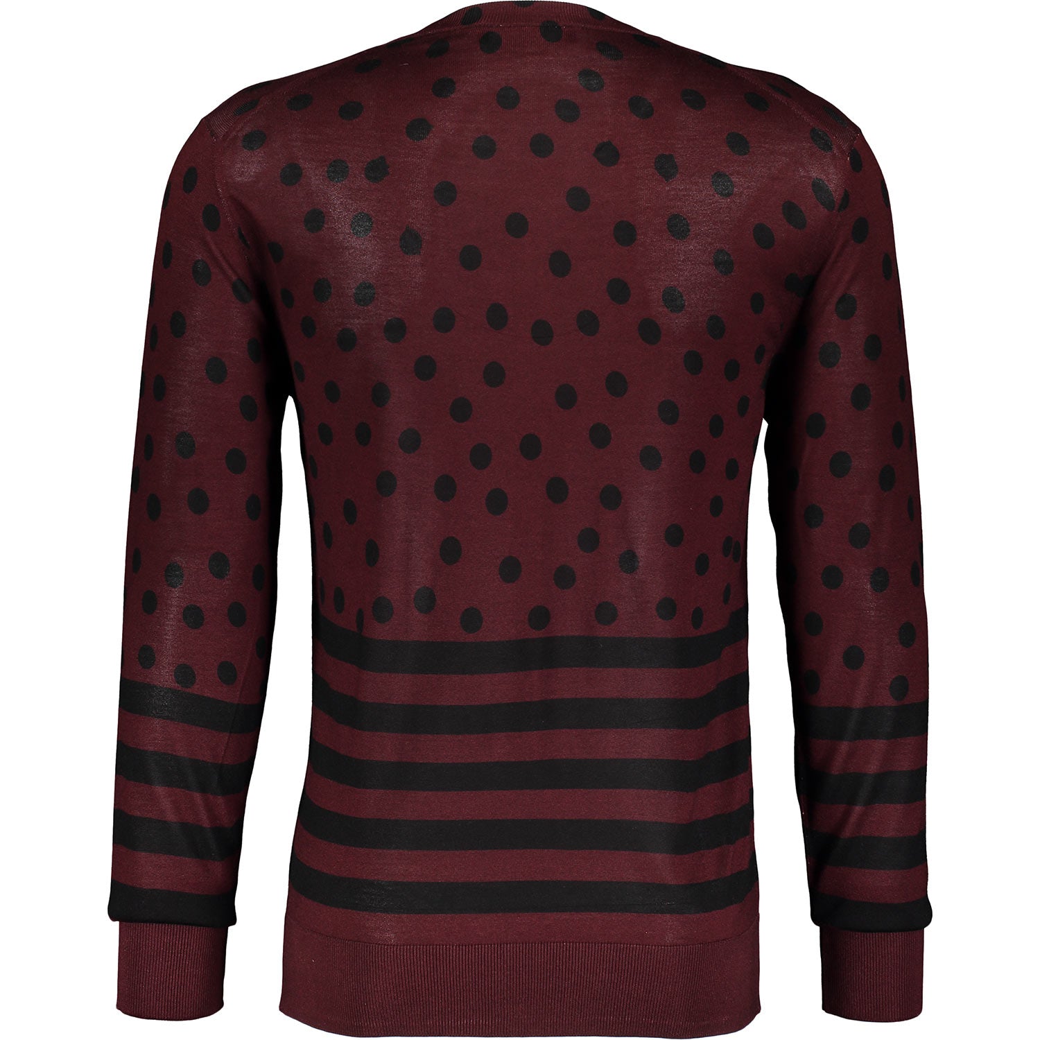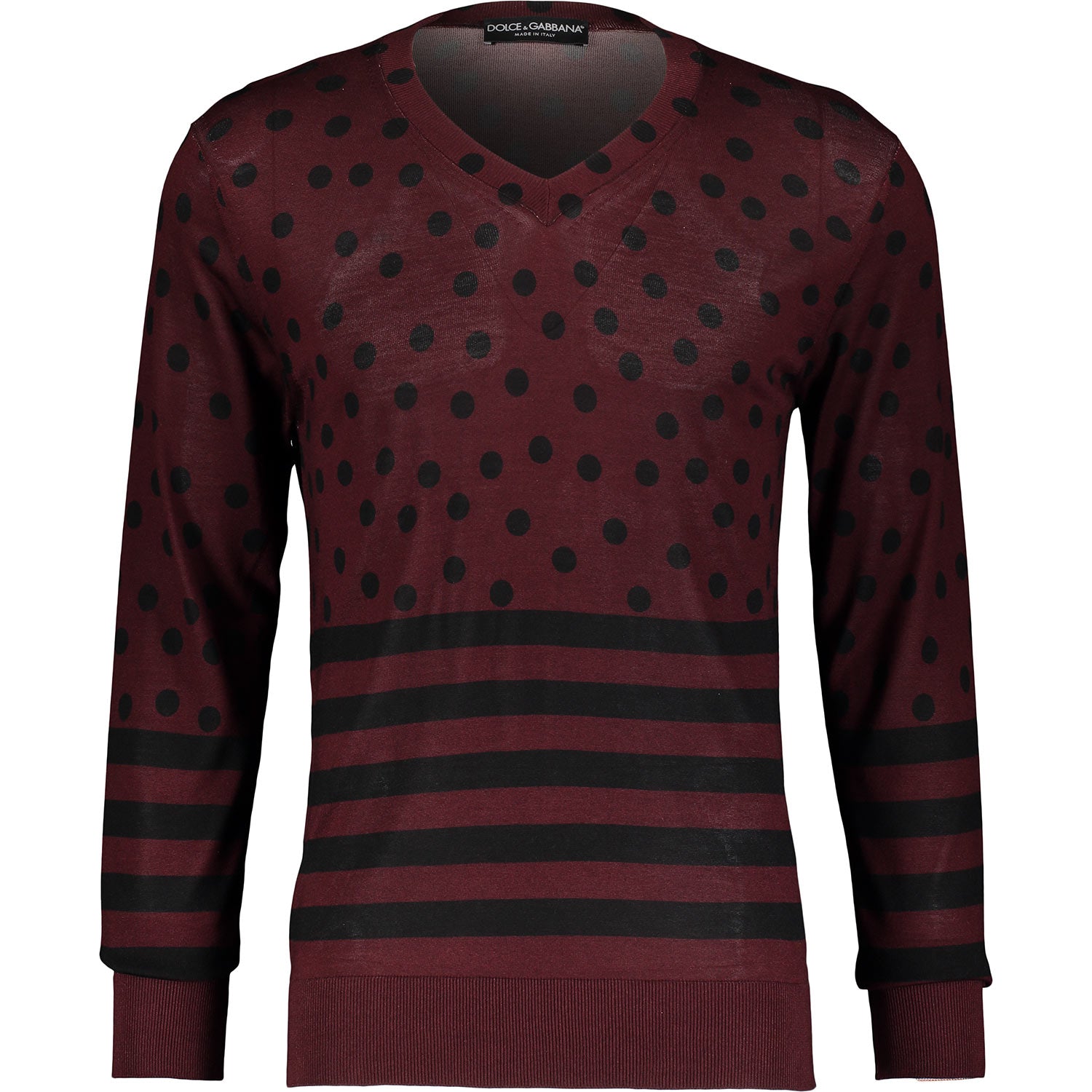 Elevate your wardrobe with this exquisite Dolce & Gabbana red patterned jumper. Crafted from 100% silk, it offers a luxurious feel and exceptional comfort. The rich burgundy hue is complemented by an eye-catching spots and stripes design, adding a dynamic yet sophisticated touch to your outfit. Featuring a flattering V-neck, this jumper blends classic style with contemporary detail, making it perfect for both casual and refined occasions. Made in Italy, it reflects superior craftsmanship and timeless elegance, ensuring you stand out effortlessly wherever you go.