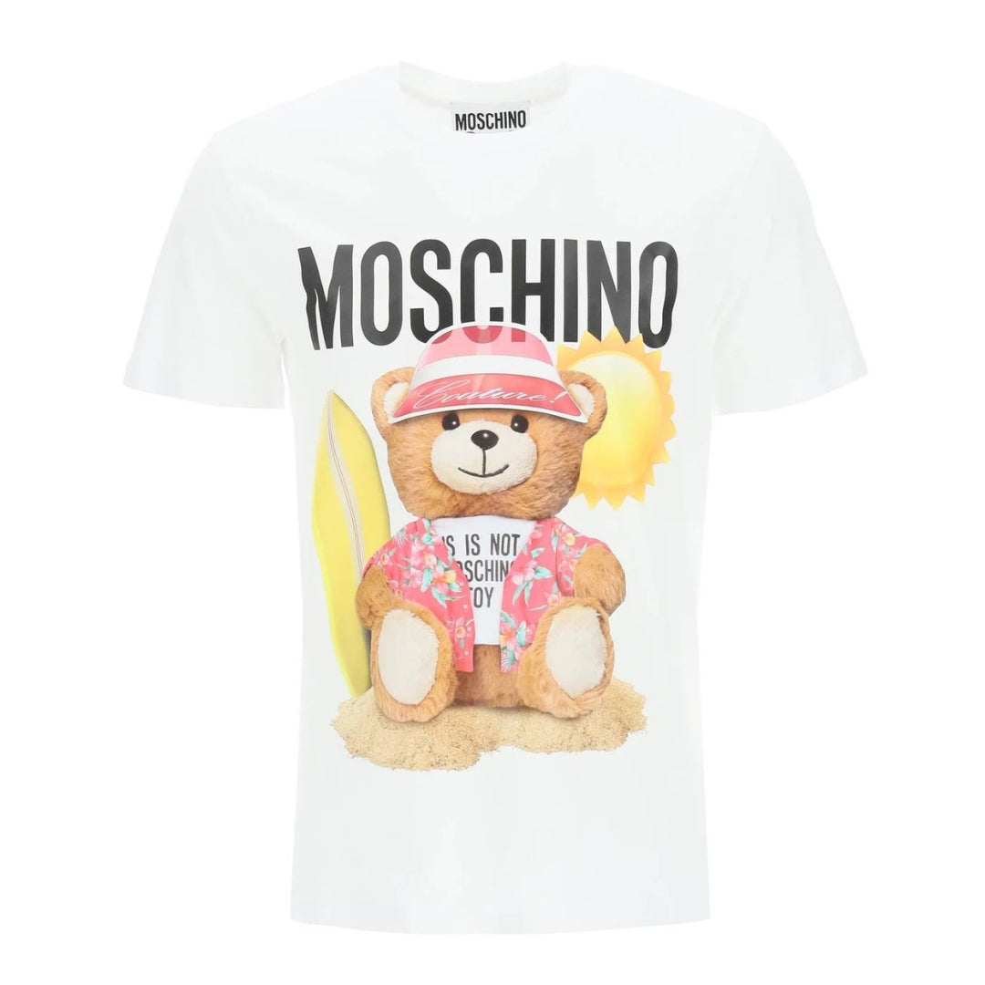 Elevate your casual wardrobe with the Moschino Sun Bear White T-Shirt, a standout piece that combines playful design with premium quality. Crafted from soft, breathable fabric, this t-shirt ensures all-day comfort while showcasing Moschino’s iconic Sun Bear graphic for a bold, stylish statement. Perfect for pairing with jeans or layering under jackets, it adds a touch of fun and sophistication to any outfit. Make a confident impression wherever you go with this unique and versatile Moschino tee that blends fashion-forward flair with everyday wearability. Made in Portugal, 100% Cotton