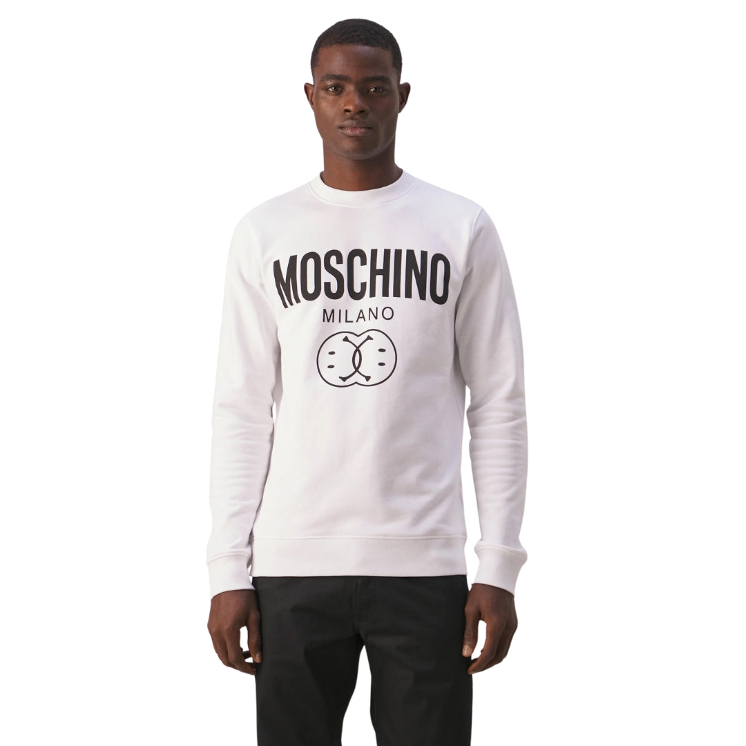 Elevate your wardrobe with the Moschino Double Smiley White Jumper, a perfect blend of playful design and premium comfort. Crafted from soft, high-quality fabric, this jumper features Moschino’s iconic double smiley graphic that adds a fun, contemporary edge to your look. Its crisp white color makes it versatile for any casual occasion, while the relaxed fit ensures all-day comfort. Whether paired with jeans or layered under a jacket, this jumper effortlessly combines style and ease, making it a must-have statement piece for those who appreciate bold fashion with a lighthearted twist.1001 WHITE JUMPER MALE, Made in Portugal, 100% Cotton